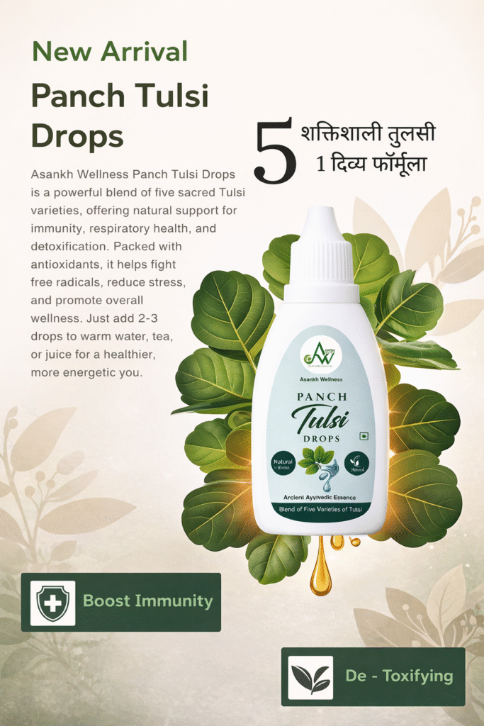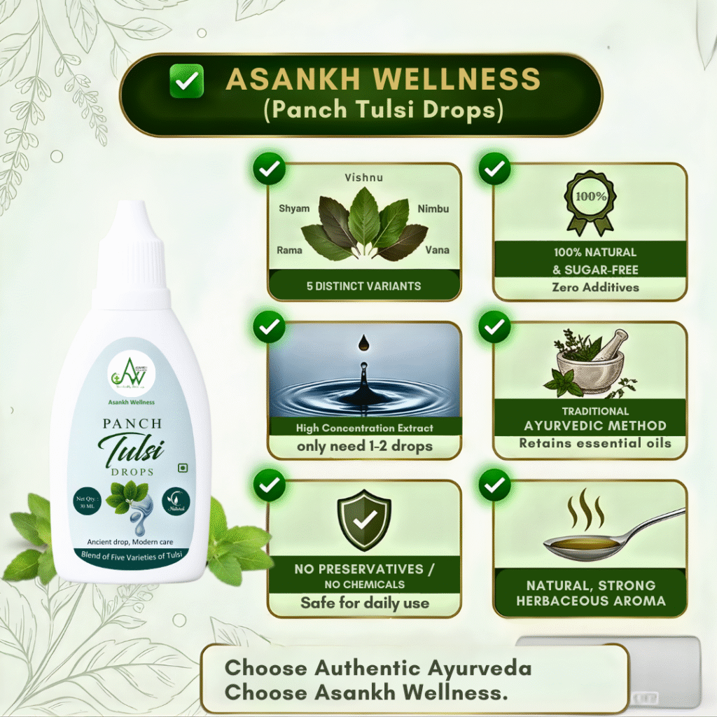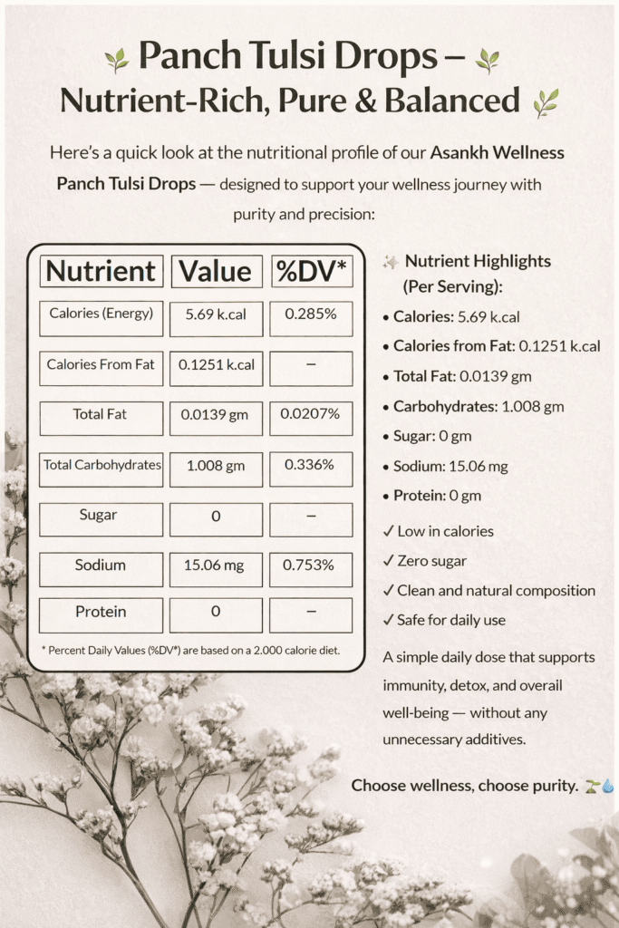 Here’s a quick look at the nutritional profile of our Asankh Wellness Panch Tulsi Drops — designed to support your wellness journey with purity and precision: